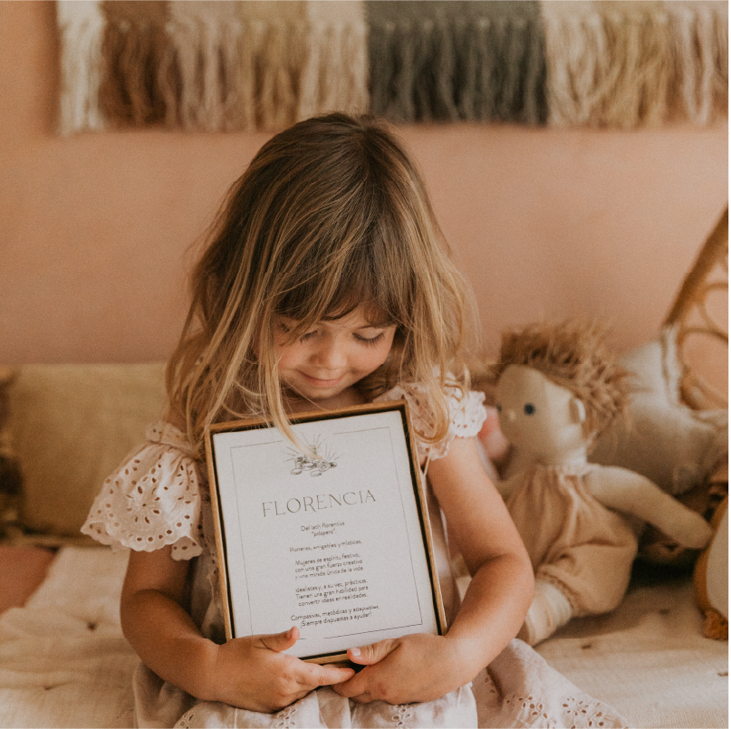 Una pieza con propósito creada para ti y con la energía de tu nombre. Con un diseño limpio y clásico y enmarcada en roble natural, para llenar tus espacios de intención y elegancia.